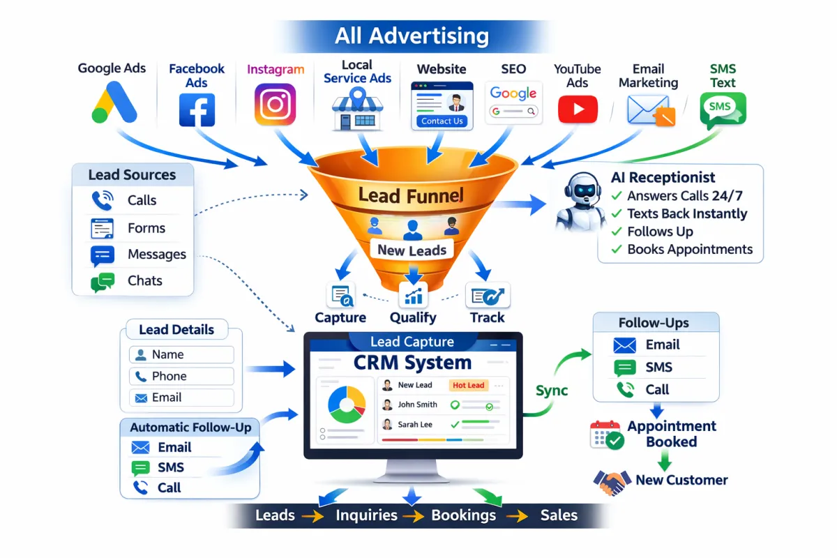Stop missing calls and wasting money on Ads. Capture more leads, respond to clients faster, automate follow-up, book more appointments on autopilot, more reviews, reduce admin & marketing workload with an AI system that works 24/7.